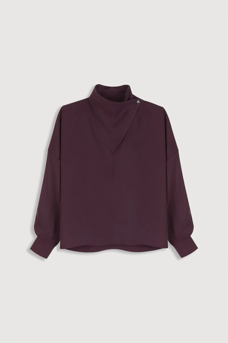 Blusa en color berenjena con cuello superpuesto y cierre con botón en hombro. Esta camisa es de manga larga y tiene puños con botones.