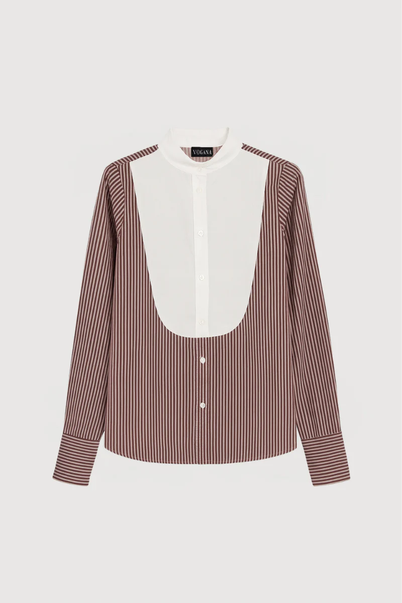 Camisa de rayas en color burdeos con manga larga con hombros rizados y puño abotonado. Esta camisa tiene pieza a contraste en el pecho y se cierra en la parte frontal con botones.