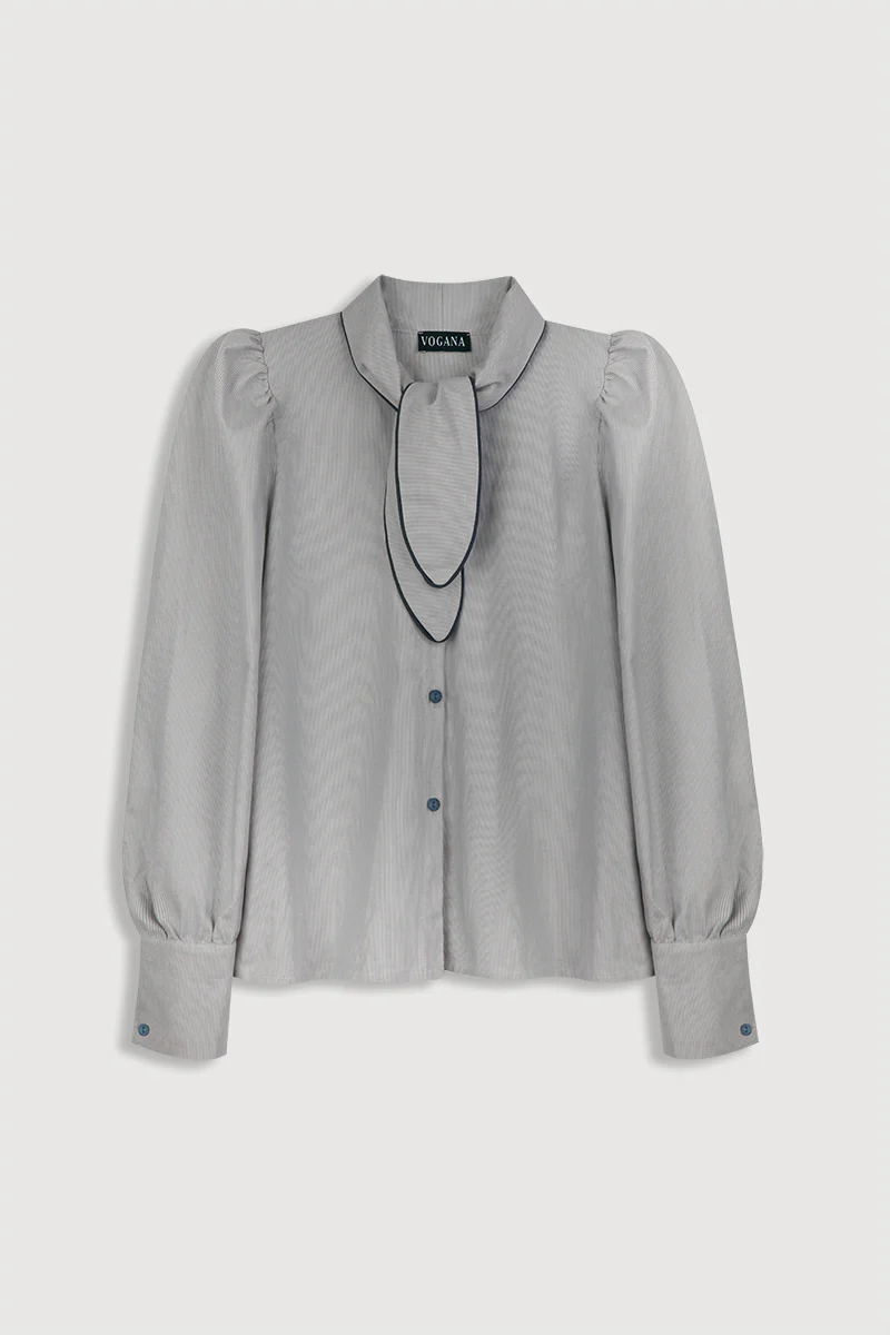 Camisa de algodón orgánico en milrayas celeste con hombros rizados y lazada en cuello ribeteada al tono. Esta camisa tiene puños anchos con botones.