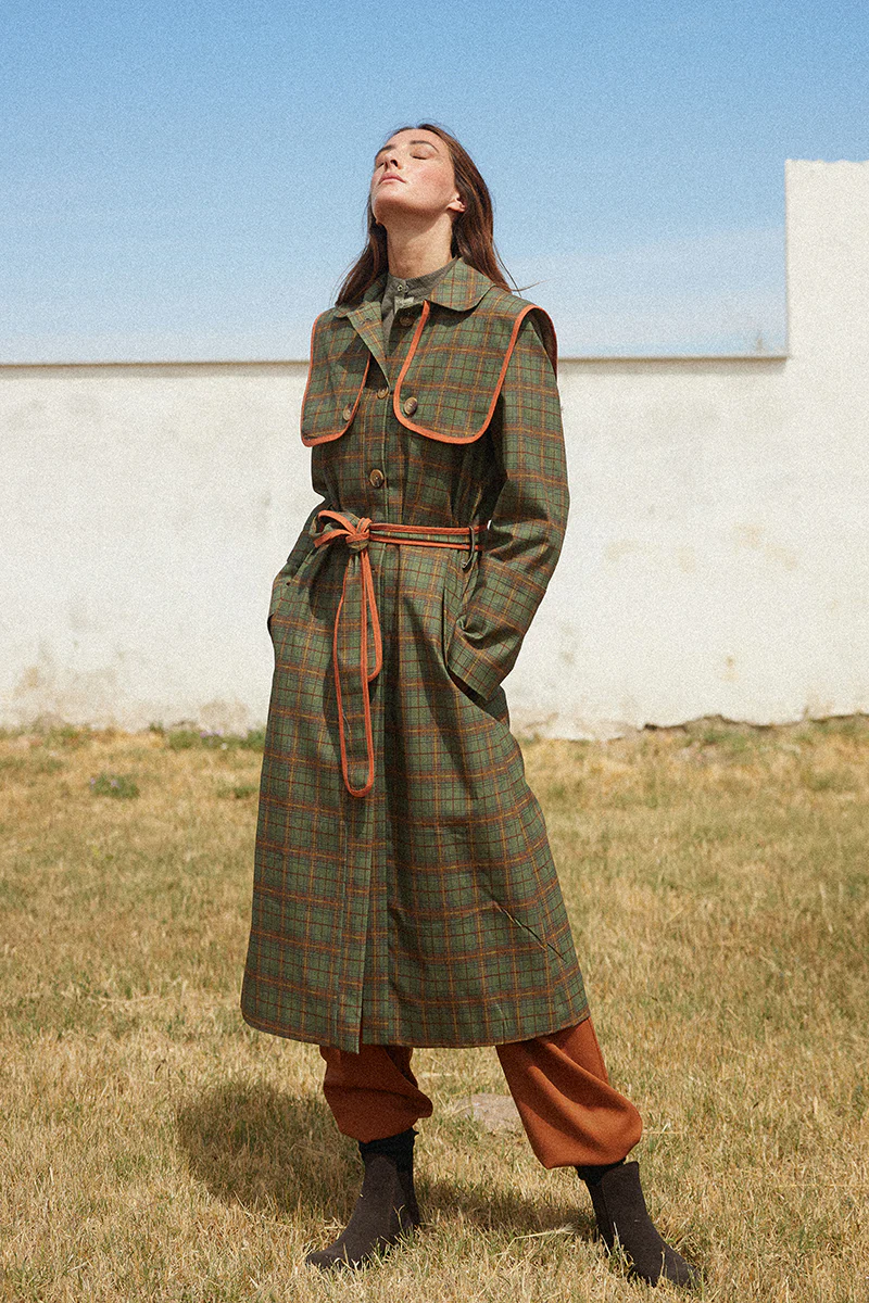 Gabardina de cuadros verdes con detalle de vivos a contraste en color caldera. Esta gabardina cuenta con solapas en los hombros y se cierra por la parte frontal con botones. Incluye cinturón confeccionado en la misma tela y cuenta con forro y bolsillos. El imprescindible que no podrá faltar en tu armario este Otoño.