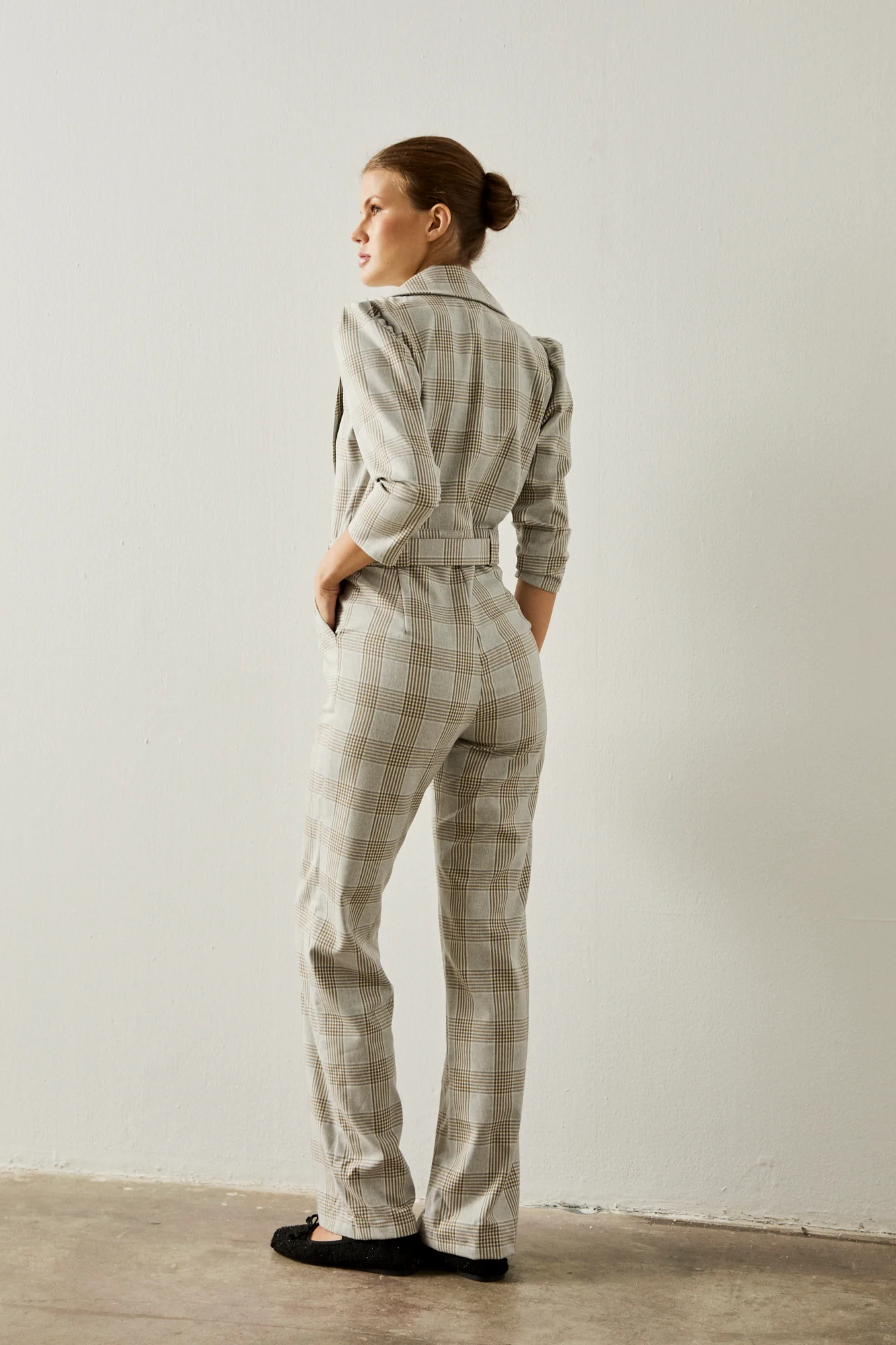 Mono de manga larga abullonada y escote en uve con solapa. El pantalón, de talle alto, cuenta con pinzas, pernera recta y bolsillos. Incluye cinturón con hebilla forrado en la misma tela.
