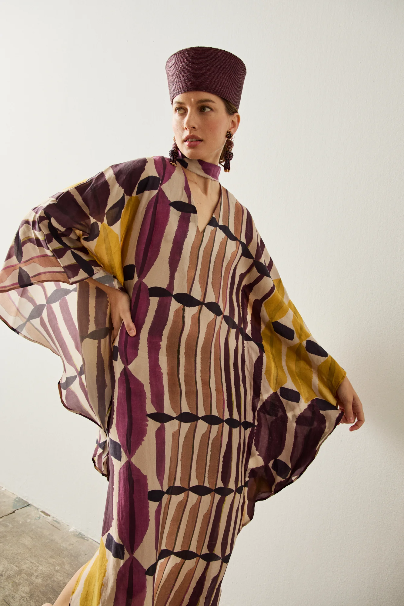 Vestido midi estampado con escote en V y cinta en cuello que se cierra con botones por la parte trasera. Este vestido fiesta tiene manga de murciélago y aberturas en los laterales de la falda.