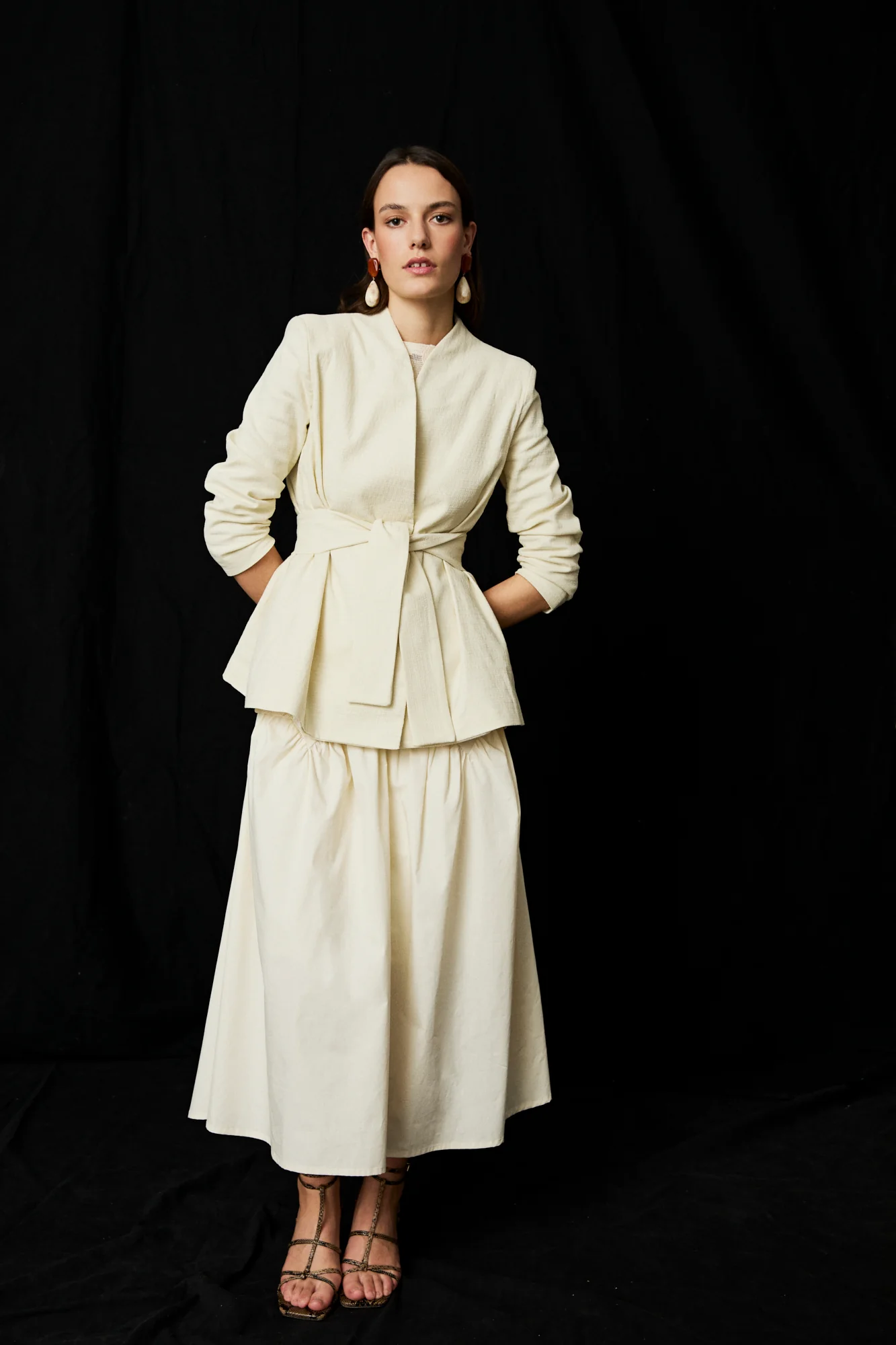 Vestido midi en color crema con top asimetrico de flores bordadas y lazadas en el lateral. Este vestido tiene cuello a la caja y falda con detalle en la cadera. Está forrado y se cierra por la parte trasera con cremallera invisible.